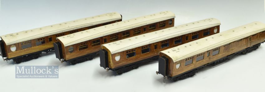 Rake of 4x LNER Teak 1st, O Gauge Kenard Fine-scale Model Railway Carriages/Coach, well-built kit models with1 brake end coach, all with sprung buffers and drop couplings, quality examples all with Kenard model label to their bases, 46cm long (4)