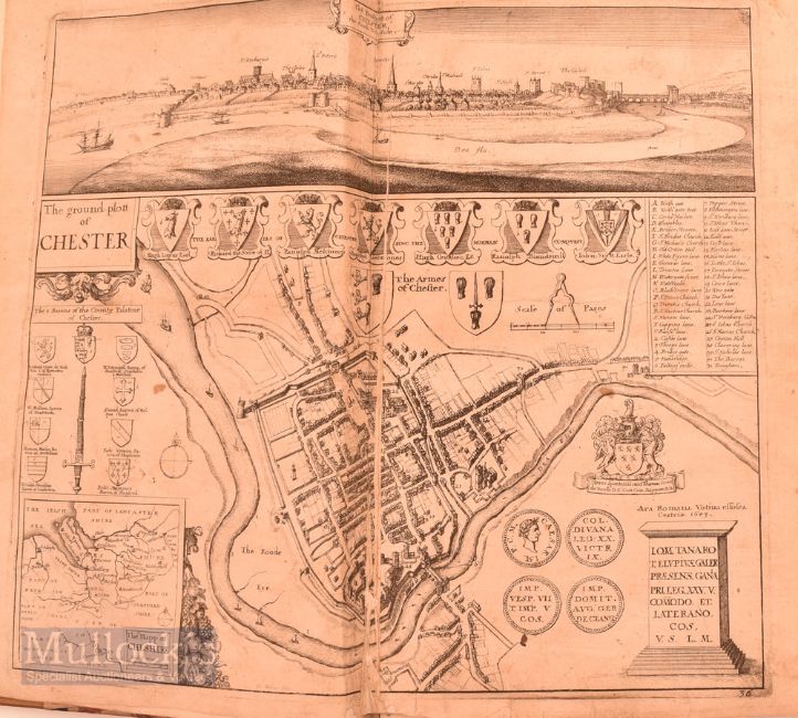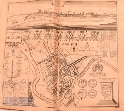 The Vale Royal of England or, The County Palatine of Chester. To Which Is Annexed an Exact Chronology of All Its Rulers and Governors, also, An Excellent Discourse of The Island Of Man, Published By Mr Daniel King, 1656 First Edition of this scarce and important history. Engraved title, text title 8 pages of prelims 1-99, 5 pages of Table, 1-239, 10 pages, 1-55, title page, 3 pages, 1-32. Additional engraved title, 2 double page maps/plans, 14 engraved plates (1 of which is folding, double page engraved plate and several engraved illustrations within the text, one full page (missing two plates). A First Edition of this scarce and important and detailed history illustrated by Wenceslaus Holler, with maps and views, plus Coat of Arms of families of the county. Along with a separate section to the rear being "A short Treatise on the Isle of Man". Has been rebound in half leather and marble cover boards. Five raised bands, red title label and gilt titles to spine. Size 7½" × 11½"