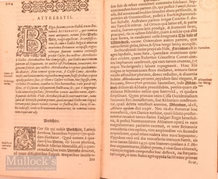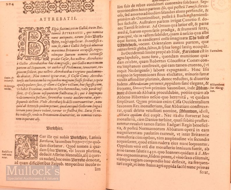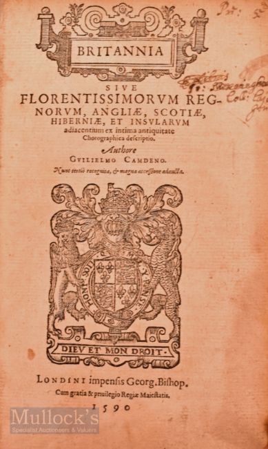 Great Britain - Camden's Britannia Titled; Britannia Sive Florentissimorum Reg Norum, Angliae, Scotiae Hiberniae Et Insularum Adiacentium Ex Intima Antiquitate Chorographica Description Authore Guilielmo Camdeno Nunc Tertio Recognita & Magna Accessione Adaucta Londini Impensis Georg.Bishop Cum Gratia & Privilegio Regiae Maiestatis 1590 Title Page [14] 762 [22] Complete As Called For.. The First Word of The Title Is Enclosed In A Woodcut Frame, And There Are A Couple Of Charming Woodcuts Devices And Sketches In Places. There Is A Dedication To William Cecil Lord Burleigh In Which He Gives Thanks Also To Abraham Ortelius. "Britannia Is A County-By-County Description Of Great Britain And Ireland. It Is A Work Of Chorography: A Study That Relates Landscape, Geography, Antiquarianism, And History To Describe In Detail The Great Britain Of The Then Present, And To Show How The Traces Of The Past Could Be Discerned In The Existing Landscape. By This Method, He Produced The First Coherent Picture Of Roman Britain "There Is A Dedication In Old Leather Binding, Size 4¾" X 7¼" (William Camden (1551-1623) Was An English Antiquarian, Historian, Topographer, And Herald, Best Known As Author Of Britannia, The First Chorographical Survey Of The Islands Of Great Britain And Ireland, He Studied At Oxford, Was For Some 4 Years Headmaster Of Westminster School, He Travelled Extensively Across England Gathering Material For This Great Epic Work, Which Made Him The Most Famous Writer Of That Time And Becoming The Official Historiographer Of Queen Elizabeth