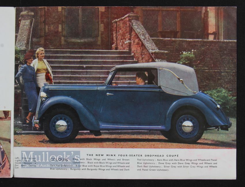 The New Hillmax Minx 1939 Brochure - a large threefold multicoloured brochure illustrating and detailing with specifications and prices their range 3 models of cars from Safety Saloon for £163 to a Drophead Coupe for £210. Printed on fine semi-gloss folds out to size 30" x 7¾". Manufactured at their Works in Coventry