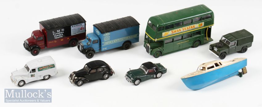 Assorted Collection of Diecast vehicles to include Corgi Land Rover, Corgi LNER Vanguard HMV Corgi lorry, LMS, TR3, Sommerville model, Solido Green London Country Bus and a clockwork boat by Penguin