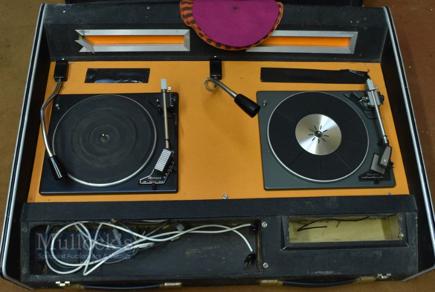 Retro Garrard SP 25 Mk III Twin DJ Mixing Deck with two turntables, 2x lights about tables, missing mixing inners, removable lid, built into hard carry case, two handles, measures width 99cm, depth 75cm, height 25cm approx.