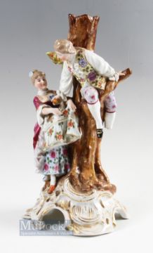 Late 19th century Sitzendorfer Candlestick depicting man and woman by a tree picking apples, bears blue crossed lines mark to base, A/F, man missing foot with sconce missing, possibly previously converted to a lamp, height 31cm