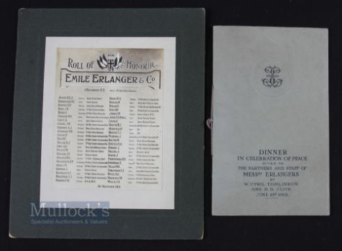 c1915-1919 WWI Roll of Honour Emile Erlanger & Co of staff serving different military companyies British and French + dinner celebration of peace 1919, give to staff and partners of the company Erlangers famous for their plans for a channel tunnel, banking and finance