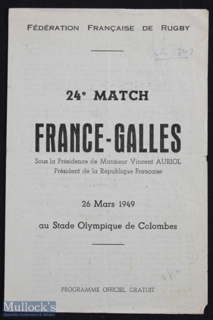 Very rare 1949 France v Wales Signed Rugby Programme: Neatly fully signed, and overall VG for this second Welsh visit to Colombes post-WW2. France won 5-3. Seldom-seen & most desirable