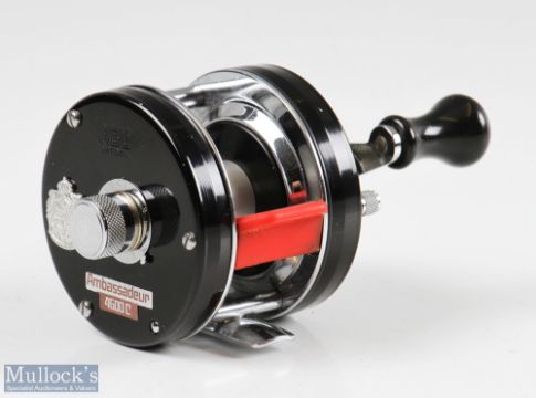 ABU Ambassadeur 4600C multiplying reel in black finish, foot stamped 780200, twin handles, red thumb bar, high speed sticker, in good, clean condition overall
