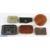 An interesting collection of Fly Boxes - Burr walnut fly box 5.25" x 3.25" with 17 small salmon flies; an unusual 5" diameter round wood Kilroy fly box with magnet closure and 7 salmon flies; Mustad Universal insect collection with 12 flies; foam box with 6 named trout flies; Orvis sheepskin patch with 9 trout wet flies; small, unusual fly tin 4" x 2.75" with fish and flies embossed on lid, with over 30 loch flies (6)