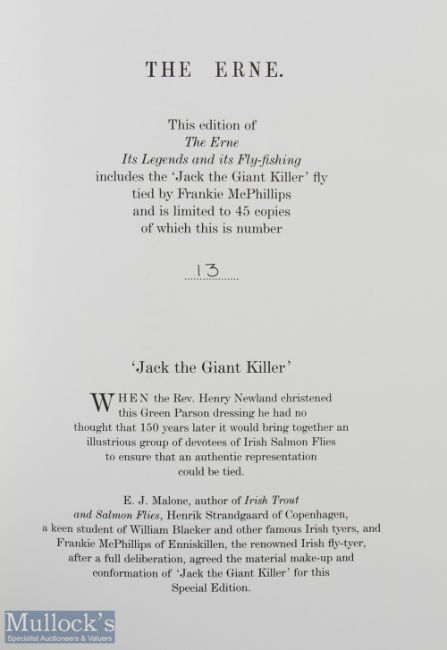 Rev Henry Newland -The Ernie -its Legends and its Fly Fishing - Flyfishers Classic Library 1999 limited edition 13 of 45 copies 2002 with Jack the giant killer fly tied by Frankie McPhillips inside, full green leather binding, slip case - this has the previous owners' initials of Sir R Leigh embossed to front