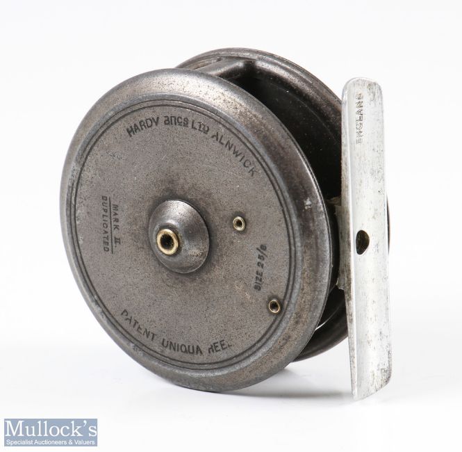 Hardy Bros Uniqua 2 5/8" Dup Mk II alloy trout fly reel with a smooth alloy foot, horseshoe latch, stamped 'patent 24245' internally, signs of surface wear, turns freely o/w