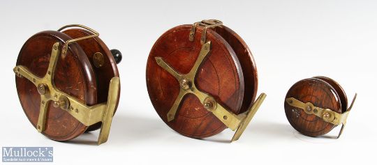 Unnamed star backed Centre Pin Reel, 5.5" spool, rear brass drum flange and back plate, twin ebonised handles on brass mounts, Bickerdyke line guard, runs well; unnamed star backed Centre Pin reel, 6" spool, twin ebonised handles, centre drag knob, rear brass drum flange and back plate, sliding line guard, runs well; and unnamed strap back Centre Pin Reel, 3" spool with twin handles, ratchet knob, very stiff (3)