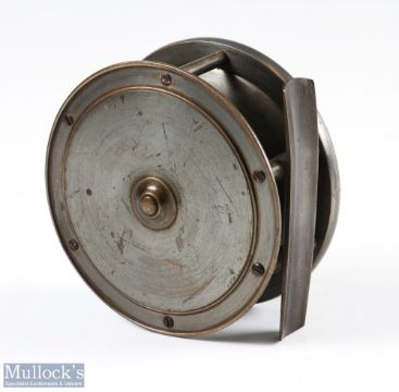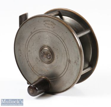 Hardy Bros 3 3/4" bronzed brass fly reel with oval maker's mark to plate wind, large handle (small hole), slight kink to foot, strong fixed check, runs freely