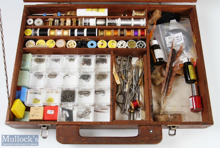 Custom Built Wooden Fly Tyers Case with contents comprising vice and comprehensive range of tools/threads/silks/wires and floss, broad range of hooks, feathers, wings/capes and fur