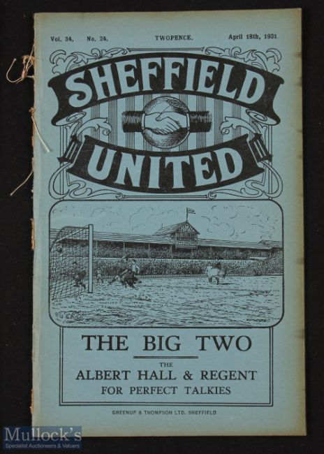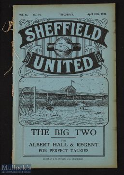 1930/31 Sheffield Utd v Grimsby Town Div. 1 match programme 18 April 1931 at Bramall Lane; ex b.v., spine wear, o/wise fair.