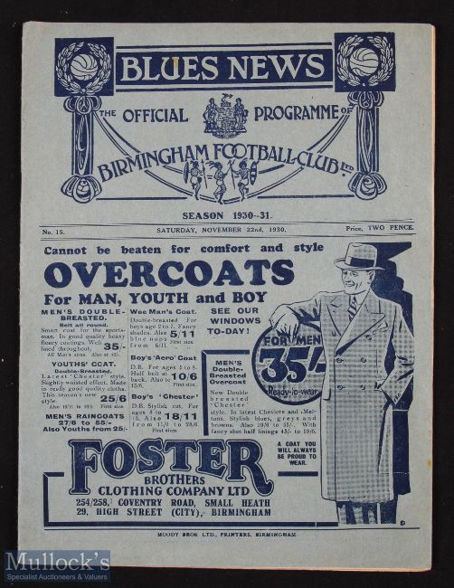 1930/31 Birmingham City v Grimsby Town Div. 1 match programme 22 November 1930; fair/good condition.