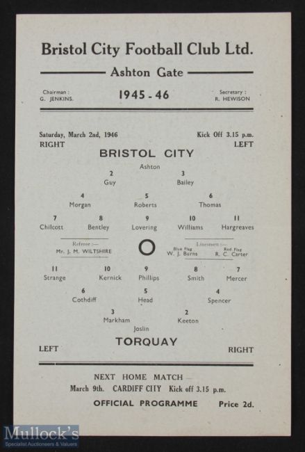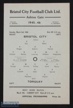 1945/46 Bristol City v Torquay United Div. 3 South (Cup qualifying) match programme 2 March 1946, single sheet, good condition.