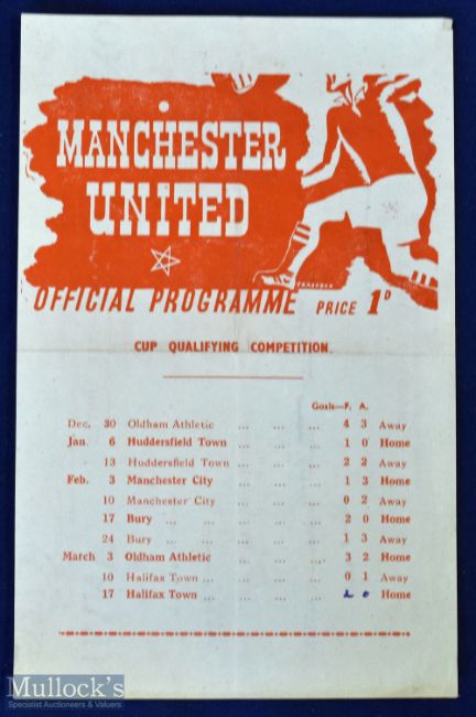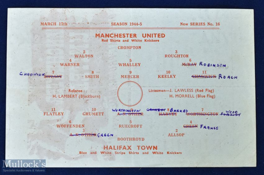 1944/45 Manchester Utd v Halifax Town war league north cup qualifying match programme 17 May 1945, single sheet; team changes o/wise fair/good.