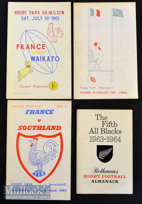 1961 French Rugby Programmes etc (4): Three issues from the famous first tour by 'Les Tricolores' to NZ, v Waikato, N Auckland & Southland, journalist's brief notes to centre pages o/wise VG; plus neat copy of the Rothmans Almanack for the All Blacks' UK tour 1963-4