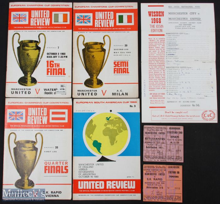 Selection of Manchester Utd match programmes 1968/69 Rapid Vienna + match ticket, 1968/69 v Estudiantes (World club championship) + ticket, 1968/69 v Waterford, 1968/69 v AC Milan (EC s/f) plus 1968 Manchester Utd v Manchester City 21 July 1968 cricket match at Old Trafford (cricket ground), fair condition.