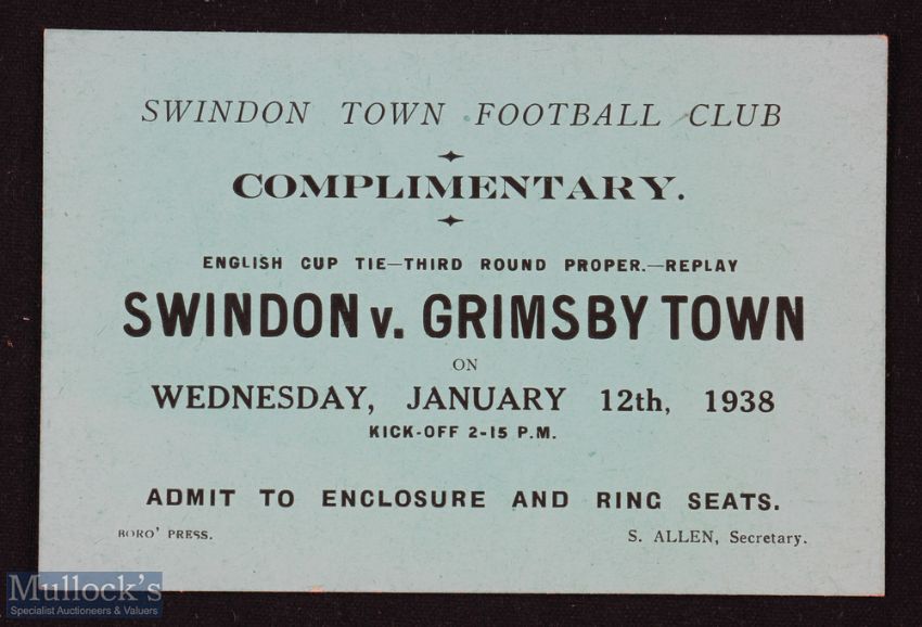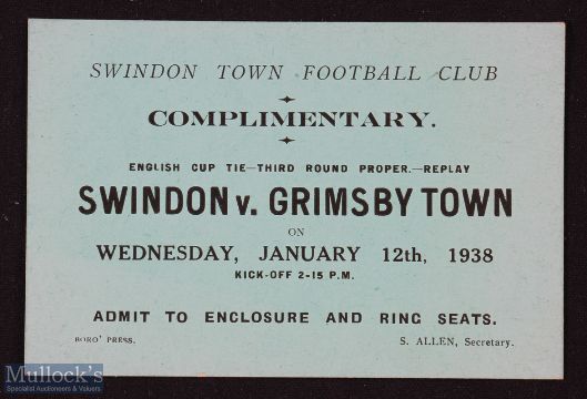 1937/38 Match ticket Swindon Town v Grimsby Town FAC replay 12 January 1938, (admit holder to enclosure), complimentary issue. Good.