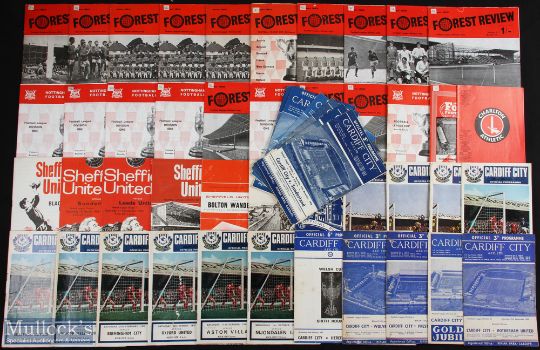 Collection of football programmes to include Cardiff City v 1956/57 Burnley, Sunderland, Bolton Wanderers, Portsmouth 1957/58 Barnsley, Doncaster Rovers, Blackburn Rovers (FAC), 1958/59 Lincoln City, Charlton Athletic, 1959/60 Rotherham Utd, Aston Villa, 1960/61 Preston NE, Wolves, Burnley, 1966/67 Hereford Utd (Welsh Cup), 1969/70 (7) incl. Wrexham (Welsh Cup), 1970/71 (3) incl. Arsenal youth (FA youth cup final 2nd leg): Sheffield Utd v 1961/62 Birmingham City, 1962/63 Bolton Wanderers, 1966/67 Sheffield Wednesday, 1967/68 Leeds Utd, Sunderland, 1968/69 Blackburn Rovers: Nottingham Forest v 1962/63 Southampton (FAC), 1968/69 (12) including WBA (FLC), Manchester City (Dec-postponed), 1969/70 (7) including Oxford Utd (FLC), Everton, Bristol City 1968/69 (3), 1969/70 (8), 1971/72 (2), 1973/74 (2): Blackpool v 1961/62 , 1962/63 (3) incl. West Ham Utd, 1963/64 (2), 1964/65 Leeds Utd, 1966/67 , 1968/69 (2), 1969/70 (2), 1970/71 Newport County (FLC) x 3: Birmingham City 1959/60 West Ham Utd, 1960/61 West Ham Utd, 1961/62 Espanol (ICFC), 1963/64 (3), 1964/65 (5), 1965/66 (3), 1968/69 (6), 1969/70 (2), 1971/72 Varied condition, fair at best Total (100+)