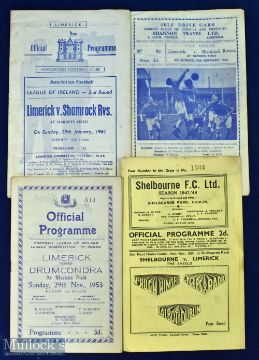 Irish programme selection to include 1947/48 Shelbourne v Limerick (Shield game), 1953/54 Limerick v Drumcondra (League 1st round), 1954/55 Limerick v Shamrock Rovers, 1960/61 Limerick v Shamrock Rovers (League 2nd round), 1963/64 Drumcondra v St Patrick's (Shield); Fair condition. (5)