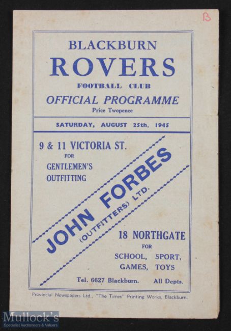 1945/46 War League North Blackburn Rovers v Grimsby Town programme 25 August 1945 (1st match of the season) at Ewood Park; 4 pager has slight mark, o/wise fair/good.