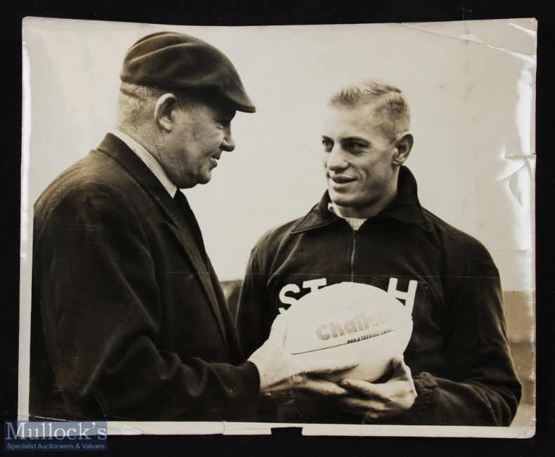 Black & White photograph size 250 x 200mm St Helens rugby league: Tom Van Vollenhoven meeting Jim Sullivan (team manager) circa late 1950's; NB: In 11 years at St. Helens Tom scored 1176 points for the team. Fair/good. (1)