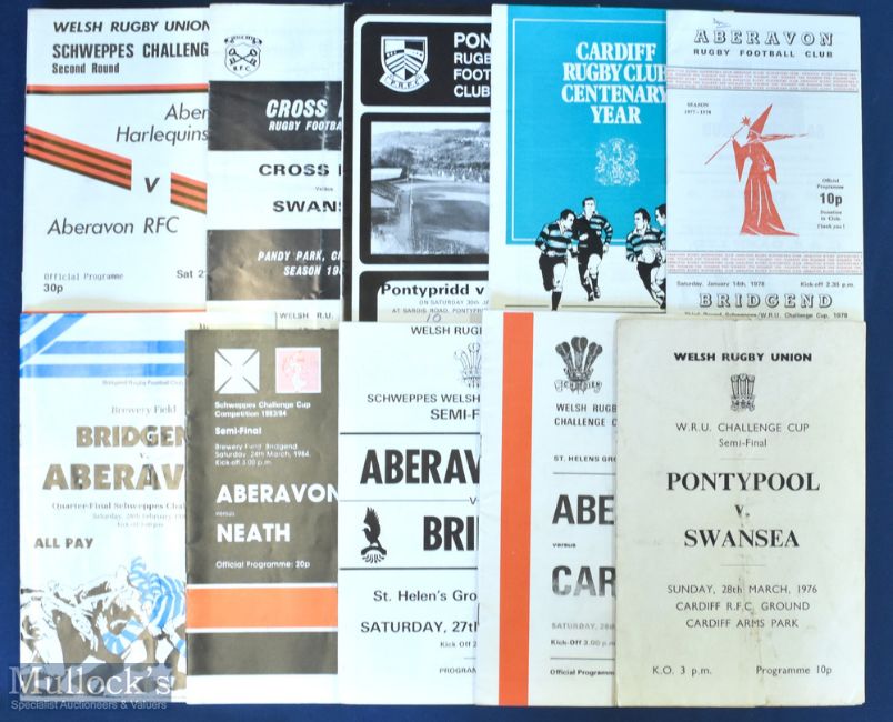WRU Cup Semi Finals etc Rugby Programmes (10): Semis: Pontypool v Swansea 1976, Aberavon v Cardiff 1977, Aberavon v Bridgend 1982 and Aberavon v Neath 1984; Quarter: Bridgend v Aberavon 1981; Jan rounds: Cardiff v Llanelli 1977, Aberavon v Bridgend 1978, Pontypridd v Aberavon 1982; Dec rounds: Cross Keys v Swansea 1983; Aberavon Harlequins v Aberavon 1985. VG