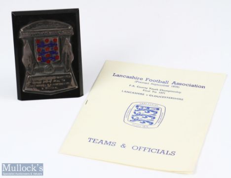1970/71 FA County Youth Cup Competition Lancashire v Gloucestershire Final Plaque with enamelled FA crest to front with engraved details below with name B. Davies (linesman), length 12cm, together with a teams and officials programme (2)