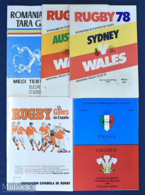 Wales Abroad Rugby Programmes Programmes (5): Some harder-to-find issues here, to inc 1978 Sydney v Wales and Australia v Wales 2nd Test, JPR had to flank and G Price broken jaw game; 1983 disastrous defeat by Romania in Bucharest and also Spain tour programme; plus Italy 'B' v Wales 'B' in Rome 1986. V