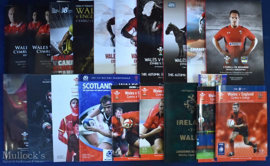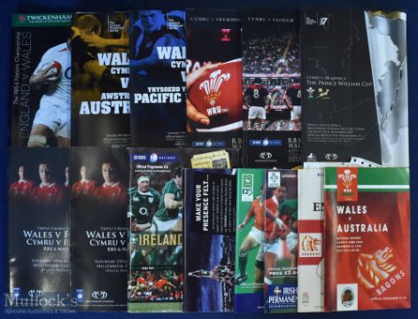 1992-2017 Wales H/A Rugby Programmes/Tickets (Qty): 33 substantial glossy issues inc eight aways, 5/6 Nations & Autumn Tests, Barbarians etc, many with tickets, hospitality folders, passes etc. Near-mint condition