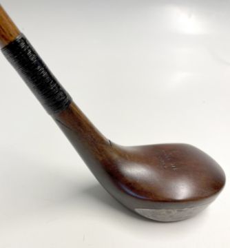 Unusual Double Patent G Forrester Elie Spliced neck brassie - fitted with a Patent one-piece leather over grip stamped with makers stamp mark just above the bottom whipping – scarce, appears with crack on right side of club head – see further image