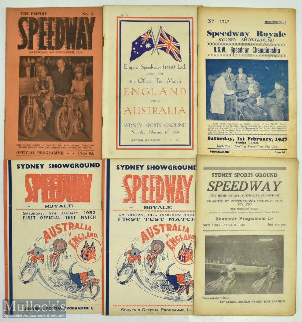 1935-53 Australia + Sydney Speedway Programmes, to include the Empire speedway 30th Nov 1935, England v Australia 11th Feb 1939, speedway royale 1st Feb 1947, Newcastle v Bathurst 1949, Australia v England 1952 and 1953 (6)