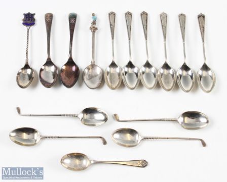 Selection of Silver Golfing Teaspoons incl set of 6 hallmarked Sheffield 1932, 4 golf club handled spoons with mixed Birmingham hallmarks, Walker & Hall Sheffield hallmarked spoon and another Birmingham hallmarked enamel spoon, total weight 180 grams, together with a pair of silver plated spoons and another with golfer terminal (15)