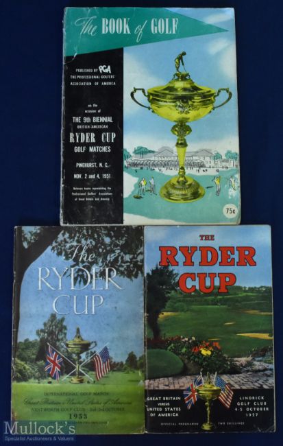 1951, 1953, and 1957 Official Ryder Cup Golf Programmes - features 1951 at Pinehurst date 2-4 Nov; 1953 Wentworth Programme, wrappers soiled, note this was the first time that Republic of Ireland players were selected; and 1957 Lindrick Golf Club programme c/w draw sheet coupons - general condition mixed (F/) (3)