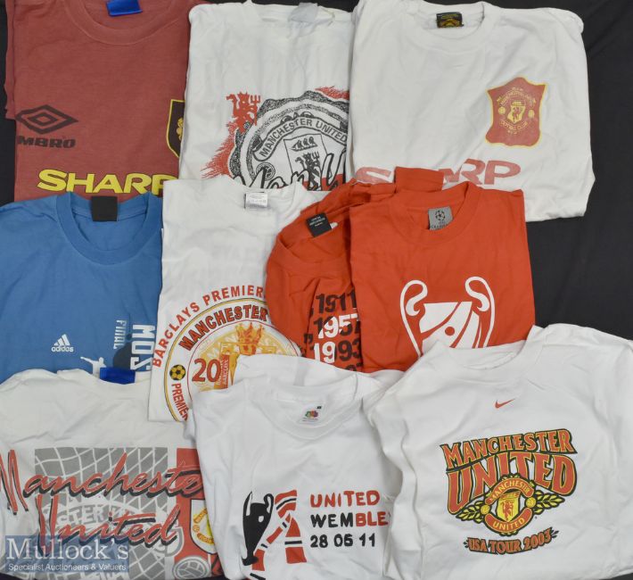Manchester United Themed T-Shirts, to include Sharp Umbro XL x2 Adidas Moscow 08 L, Manchester United Umbro L x2, Premier champions 2007 L, UEFA champions league Moscow 2008 M,1908-2009 champions S, United Wembley 28/05/11 S, Nike USA Tour 2003 XL long sleeved top, by assorted makers, some are official Manchester United merchandise in good used condition (10)