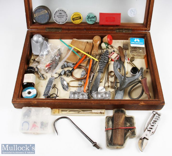 A treasure trove of fishing accessories in a large (19" x 13" x 4" approx.) glass topped case, to include tools, line dressing, multi tool, moulds, scales