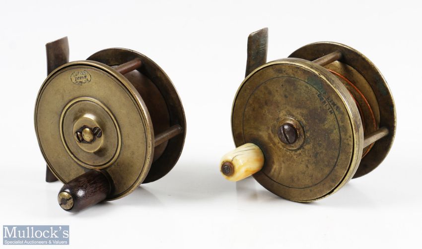 Two J Flint, Dublin 2 5/8" brass reels both plate wind with original fat knobs, both stamped with makers marks to face plates, one face plate at an angle and catches on a rim dent (2)