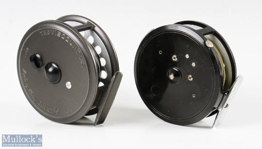 Hardy Alnwick the Viscount 150 alloy salmon fly reel 3 7/8 inch spool with black handle and twin screw Castle latch rear tensioner alloy line guard zipped case light use. Unnamed Taiwan fly reel in the style of St Aidan 33/4 inch spool with black handle twin screw latch milled rim tensioner's runs very well (2)