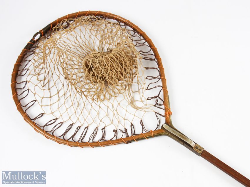 Early Farlow's wooden landing net c1890 - C Farlow, 151 The Strand, trout guy net 48" long, net head 12", square shaft, wood handle, brass head and clamp slide, alloy belt clip. Very nice