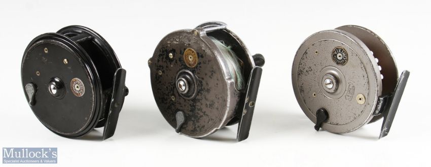 J W Young & Sons Freedex Patent Pending centre pin reel, 4" spool with centre milled drag adjuster, twin black handles on winch arm, on/off check, runs well. J W Young & Sons Viking centre pin reel, 3 ½" spool with twin black handles, 2 screw latch, on/off check, runs well. J W Young & Son Windex centre pin reel, patent pending, 3 ¾" spool with twin black handles, centre spool tensioner, Bickerdyke style line guard, on/off check, runs well (3)