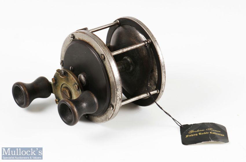 Unnamed marked 4 ½" 'Tarpon' saltwater reel with indistinct maker's marks, Rabbath drag stamped 'Pat'd Jan 14.02', with large wooden, twin handle, on/off check, additional brass foot plate to underside of foot, noted with Graham Turner Collection tag, surface wear apparent