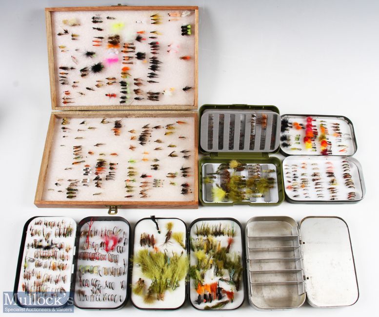 Selection of Wheatley fly boxes + Lure Box, to include foam lined, plastic and slim alloy examples plus a wooden fly box all with single hook flies (6)