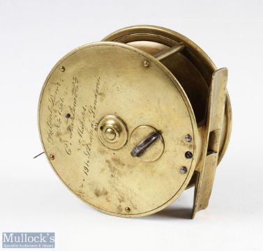C Farlow & Co, 191 Strand, Patent Lever 4" all brass salmon reel horn handle, check regulator to rear, script makers marks to rear, numbered 1561, runs smooth with check