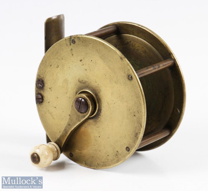 Long, Dublin brass 3" crank wind reel shaped crank handle with original turned knob, raised check housing to rear with stamped makers marks, runs smooth, a lot of movement to the foot mounting