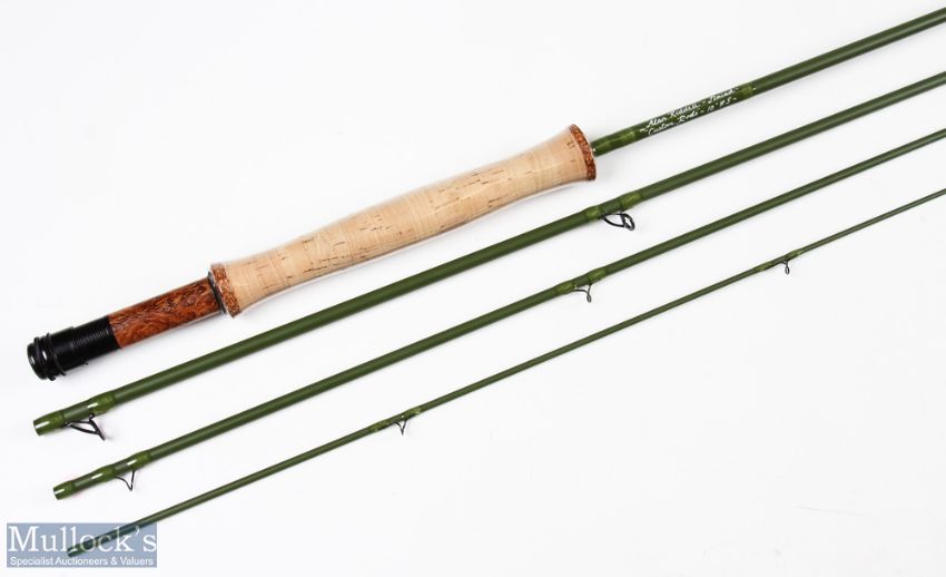 Alan Riddell custom rods carbon fly rod 10 ft 4pc line 5 # alloy up locking reel seat with burr wood insert lined stripping guides plastic still on handle MCB/hard tube looks unused.
