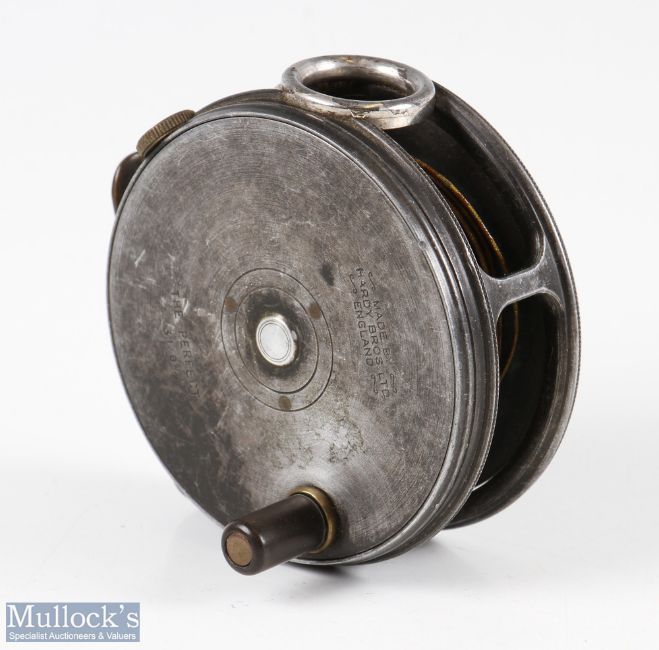 Hardy Bros Perfect 3 1/8" alloy trout fly reel with plated line guide, smooth brass foot, ebonite handle, surface wear apparent, runs well o/w, very small dink to rim