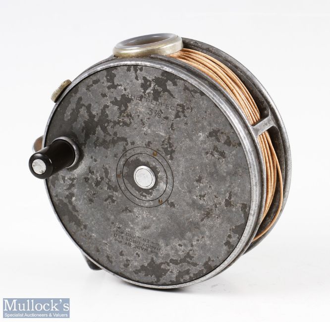 Hardy Bros England The Perfect 3 7/8" alloy trout reel black handle, agate line guide, alloy foot, crack to rim near foot with overall signs of wear, some minor surface corrosion like marks to faceplate