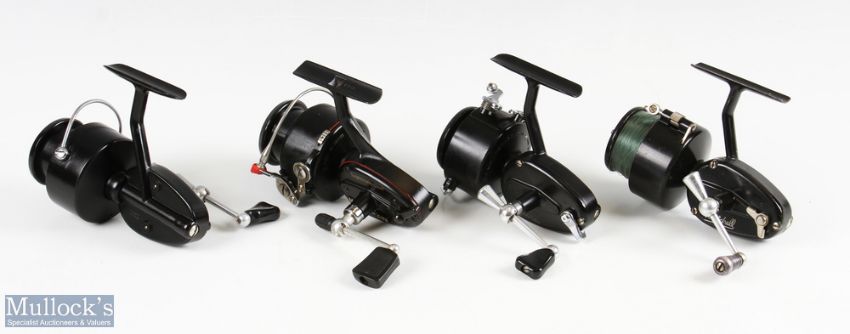 Mitchell fixed spool spinning reels (4) features an early example stamped 'W' to foot, no model number with half bail arm, LHW, a Mitchell 330 automatic stamped 403266a Mitchell Lightning cast 440A foot stamped S-5-04, and a Mitchell 301 stamped 1663222 to body (RHW) - all appear in working order, light use apparent