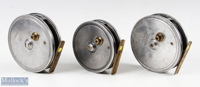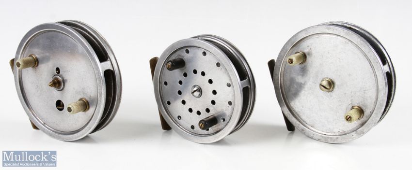 H Clayton 'The Fenland' alloy centre pin trotting reel, flick'em 4" spool with twin ivorine handles, front plate tension wheel, on/off brass check, solid brass reel seat, spins very well. Blue Phantom alloy centre pin reel, flick'em 4" spool with twin ivorine handles, on/off brass check, solid brass foot, runs well. Allcocks & Sons Redditch 'The Swift' flick'em alloy trotting reel, 3 5/8" spool with twin handles and ported face, on/off brass check, solid brass foot, runs well (3)